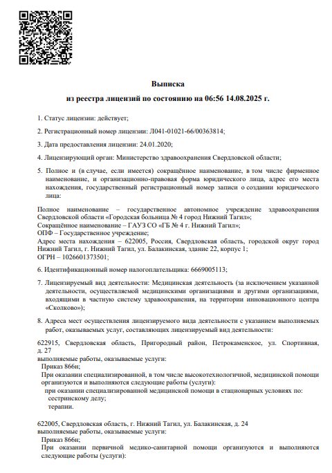 2 июня этого года мой дедушка попал в отделение реанимации и интенсивной терапии 4 городской больницы г.Нижний Тагил с тяжелейшим инсультом. Несмотря на то, что дедушка умер (тяжесть инсульта, а также возраст и сопутствующие заболевания взяли своё), я хочу оставить положительный отзыв о сотрудниках этого отделения. Спасибо врачам и медсестрам. Спасибо Вам за человеческое отношение, за прекрасный уход, за возможность пациенту сохранить достоинство в такой критический момент между жизнью и смертью. Заведующий отделением Сапронов Николай Николаевич зачастую лично отвечал на все наши вопросы, проявлял внимание и уважение. Несмотря на возраст дедушки, мед. персонал делал все возможное для его спасения.